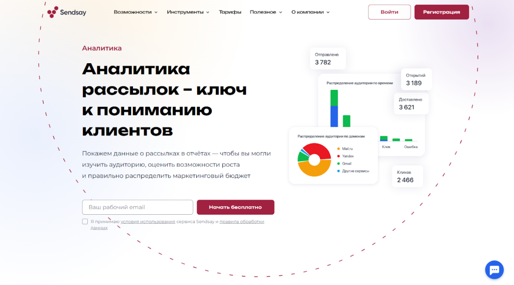 Сервис с комплексной аналитикой — статистика устройств, география, время открытий, карта кликов и сводные отчёты по рассылкам. Есть A/B‑тесты и интеграция с CRM. Поддерживает рассылки по электронной почте, SMS и в мессенджерах.
